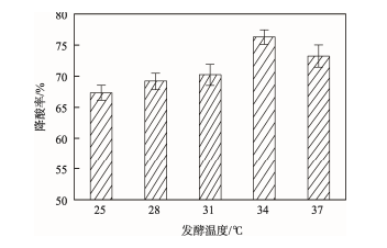 通過發(fā)酵溫度對嗜酸乳桿菌進(jìn)行發(fā)酵,以降低藍(lán) 靛果果汁的酸度,其結(jié)果見圖 2。在一定范圍內(nèi),各 溫度下果汁發(fā)酵結(jié)束后,發(fā)現(xiàn)在 34 ℃時降酸率最大, 達(dá)到 76.36%。在發(fā)酵過程中,溫度的變化對嗜酸乳 桿菌的生長狀態(tài)有較大的影響,適宜的溫度使其具有 良好的生物活性,可促進(jìn)嗜酸乳桿菌對果汁發(fā)酵能力 的提升,有利于藍(lán)靛果汁降酸的進(jìn)行。隨著碳源添加量的增加,降酸率也會上升。當(dāng) 葡萄糖的質(zhì)量分?jǐn)?shù)為 3%時,降酸率達(dá)到最高值,繼 續(xù)增大葡萄糖的添加量并未見降酸率提高。原因可能 是當(dāng)嗜酸乳桿菌進(jìn)行代謝時,由于果汁中葡萄糖量的 增多,代謝速率出隨之加快,達(dá)到了促進(jìn)嗜酸乳桿菌, 從而達(dá)到了降酸的作用,而當(dāng)葡萄糖增加到一定量 時,菌體對碳水化合物已充分利用,不能完全代謝葡 萄糖,因此后續(xù)降酸效果并未得到提升。