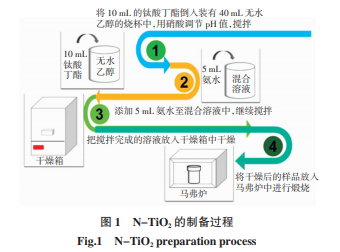 粉末的制備 圖 1 為 N-TiO2 粉末的制備過程。 采用溶膠-凝膠法制備 N-TiO2 粉末,在室溫的條 件下將 10 mL 的鈦酸丁酯溶解于 40 mL 的無水乙醇 中得到混合溶液,在其中緩慢加入硝酸,調(diào)節(jié)溶液的pH 值為 2.0。然后將 5 mL 氨水緩慢滴入鈦酸丁酯乙 醇溶液,充分?jǐn)嚢?1 h 得到分散液。將上述分散液放入 烘箱,在 80 ℃的條件下干燥 10 h 后研磨得到粉末。最 后將粉末放在馬弗爐中,在 450 ℃的條件下加熱 3 h 得到 N-TiO2 粉末。