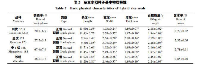 將每個品種的水稻種子隨機抽取 100 粒,人工選出裂穎種子并計算出所占比例為裂 穎率。每個品種重復 5 次取平均值。