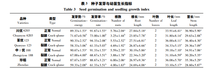 根據(jù) GB /T 3543.4—1995進行雜交水稻正常種子與裂穎種 子的發(fā)芽試驗。超純水浸種 24 h,選擇直徑 20 cm、高 8 cm 的培養(yǎng)皿進行培養(yǎng)。每個品種用正常種子和裂 穎種子為樣本分別進行發(fā)芽試驗,每個樣本重復 3 次( 皿) 。發(fā)芽試驗第 5 天記錄發(fā)芽種子數(shù)量計算發(fā)芽 勢,第 14 天記錄發(fā)芽種子數(shù)量計算發(fā)芽率,并在每個樣本中隨機選取 5 ~ 10 株幼苗測試幼苗生長指標: 根數(shù)、平均根長、莖長、葉數(shù)、葉長( 完全葉平均值) 。 數(shù)據(jù)用 Excel 2007 進行初步整理,采用 SPSS 22 創(chuàng)建數(shù)據(jù)庫進而對數(shù)據(jù)進行統(tǒng)計分析,并用獨立樣本 t 檢驗分析差異顯著性。