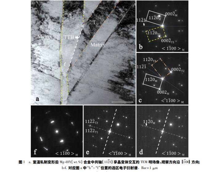 本 實(shí) 驗(yàn) 以 高 純 Mg 及 成 分 均 勻 的 Mg-Y ( 33wt.%) 中間合金為原料,在高純氬氣氛的高頻感 應(yīng)爐中熔煉成名義成分為 Mg-10Y( wt.%) 合金鑄 錠。將熔煉好的鑄態(tài)樣品置于 798 K 的馬弗爐內(nèi)熱 處理 20 h 后,冷水淬火獲得固溶處理的樣品。將固 溶樣品在 748 K 條件下進(jìn)行多道次熱軋,變形量 50%,然后進(jìn)行 798 K 保溫 9 h 退火,使樣品發(fā)生充 分的再結(jié)晶,去除內(nèi)應(yīng)力,獲得具有一定織構(gòu)晶粒 細(xì)小均勻的樣品,最后進(jìn)行變形量為 10%的單道次 室溫軋制,引入{ 1121} 變形孿晶。使用電解雙噴和 離子減薄的方法制備透射電子顯微鏡樣品。雙噴 液成分為 2% 高氯酸,98% 乙醇( vol.%) 溶液。用 FEI Tecnai 20 型透射電子顯微鏡進(jìn)行觀察,加速電 壓為 200 kV,獲 得 TEM 衍襯像和選區(qū)電子衍射 花樣。