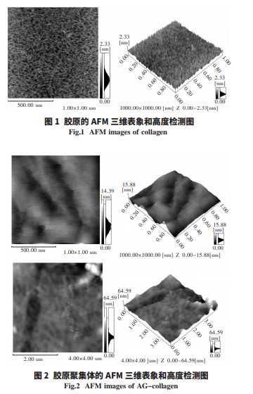 AFM 能夠觀察生物樣品的三維結(jié)構(gòu)形貌。為胎牛皮 col 的 AFM 三維表象和高度檢測(cè)圖,從 圖中可以觀察到膠原分子間相互交織纏繞,形成 了具有均一孔隙的三維網(wǎng)狀立體結(jié)構(gòu);膠原分子 直徑(約為 14 nm)較為均一,且基本排列在同一高 度。為胎牛皮 AG-col 的 AFM 三維表象和高 度檢測(cè)圖,可以看出 AG-col 直徑分布較寬,從 80 nm 到 350 nm 不等,纖維排列取向性不明顯,高度 相差很大,可推測(cè) AG-col 是由膠原纖維束或膠原 纖維編織纏結(jié)而成的三維網(wǎng)狀立體結(jié)構(gòu)。由此,我們不難得出結(jié)論:膠原聚集體的三螺 旋結(jié)構(gòu)是由更多的分子間與分子內(nèi)氫鍵維持高層 級(jí)結(jié)構(gòu)的穩(wěn)定性的,其分子間交聯(lián)結(jié)構(gòu)更加穩(wěn)定。 胎牛皮膠原因其穩(wěn)定的分子間化學(xué)鍵含量較低, 且可能在很大程度上含未交聯(lián)的三螺旋結(jié)構(gòu),其 結(jié)構(gòu)穩(wěn)定性較低。