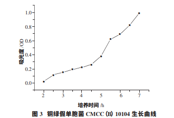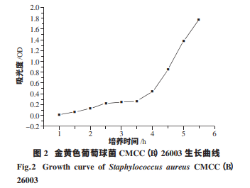 分別挑取大腸埃希菌 CMCC(B) 44102、金黃色葡萄球菌 CMCC(B)26003、銅 綠 假 單 胞 菌 CMCC(B)10104 的單個菌落接種于胰酪大豆胨液體培養(yǎng) 基,按“1.2.1”方法中的條件培養(yǎng),在不同的時間點測定菌 懸液的 OD 值,同時用生理鹽水稀釋菌懸液至適當(dāng)?shù)臐舛?后,按《中華人民共和國藥典》(2015 版)附錄 1105 平皿法 計數(shù)并記錄數(shù)據(jù)。挑取白色念珠菌 CMCC(F)98001 的單個 菌落接種于沙氏葡萄糖液體培養(yǎng)基中,按“1.2.1”方法中 的條件培養(yǎng),在不同的時間點測定菌懸液的 OD 值,同時用 0.9%無菌氯化鈉溶液稀釋菌懸液至適當(dāng)?shù)臐舛?,按《中華人 民共和國藥典》(2015 版)附錄 1105 平皿法計數(shù)并記錄數(shù)據(jù)。 黑曲霉 CMCC(F)98003 孢子呈黑色,吸光度過大,首先進(jìn) 行預(yù)實驗,最終在預(yù)實驗中選取 OD 值為 1.0 時進(jìn)行實驗 并記錄數(shù)據(jù)。