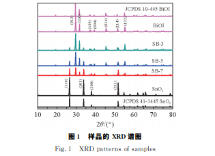 將一定量的 KI緩慢溶解到200mL 去離子 水 中,邊攪拌邊加入等物質(zhì)的量的 Bi(NO3)3·5H2O, 將SnO2 粉末加入到 上 述 混 合 液 中。改 變 SnO2 的 加入量,使 Sn/Bi的 物 質(zhì) 的 量 比 為 0∶10,3∶7,5∶5,7∶3和10∶0,分別記為純 BiOI,SB-3,SB-5, SB-7和純 SnO2。將混 合 液 在 室 溫 下 攪 拌 40 min, 再在80 ℃下攪拌3h。最后對所得產(chǎn)物進行抽濾、 洗滌和干燥得到目標產(chǎn)物。