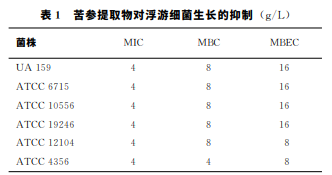 通過本實驗發(fā)現(xiàn)苦參提取物對主要 致齲細菌的 MIC為4g/L,在此濃度下抑制口腔主 要致齲菌黏附率達60%以上,并明顯抑制浮游細菌 產(chǎn)酸及合成水不溶性 EPS。在1 MIC濃度下能明顯 抑制主要致齲細菌的單菌生物膜形 成能力并優(yōu)于 0.5g/LCHX;2 MIC 濃度下對變形鏈球菌和內(nèi)氏 放線菌的單 菌 生 物 膜 清 除 能 力 優(yōu) 于0.5g/LCHX, 達到70%左右,而其余細菌是在4MIC濃度下單菌 生物膜的清除能力優(yōu)于0.5g/LCHX,達到80%以 上。在1MIC濃度下均能抑制單菌生物膜產(chǎn)酸和合成 水不溶性EPS,2MIC濃度下明顯抑制單菌生物膜產(chǎn) 酸和合 成 水 不 溶 性 EPS,抑制 率 分 別 為 64.5% ~ 94.1%和42.3%~60.0%。