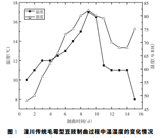 從古至今,潼川人民都是在立冬之時(shí)開始制曲,由 圖1可知,在15d左右的制 曲 過 程 中,溫 度 和 濕 度 分 別在17 ℃和82% RH 以下,且波動(dòng)范圍不大。之所 以選擇在這樣的條件下制曲,可能是由于在此溫濕度 環(huán)境中有利于制曲微生物毛霉菌的生長(zhǎng)。此情況在李 幼筠等的研究中也有報(bào)道。濕度變化呈現(xiàn)一個(gè)先上 升后略有降低的趨勢(shì),這是由于制曲過程中,外界溫度 的升高使得豉曲中水分蒸發(fā),這與所測(cè)得豉曲中水分 含量變化情況一致。而到制曲后期,豉曲中水分蒸發(fā) 到一定程度,將吸收空氣中的水分,以用于微生物的利 用,所以濕度會(huì)有一定程度的下降。