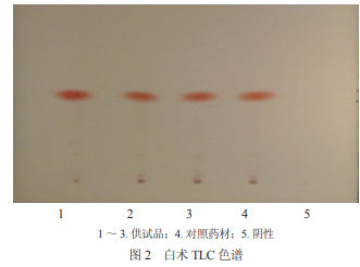 取養(yǎng)血補元合劑 30 mL,水浴蒸干,加正己烷 25 mL,置超聲儀中, 25 min 后取出,濾過,濾液即為養(yǎng)血補元合劑供試品 溶液。稱取白術(shù)對照藥材 0.5 g,加正己烷 2 mL, 白術(shù)對照藥材溶液制備方法同上。照薄層色譜法 (《中國藥典》2015 年版四部通則 0502)試驗,吸 取養(yǎng)血補元合劑供試品溶液、白術(shù)對照藥材溶液各 10 μL,分別點于同一硅膠 G 薄層板上,以石油醚 (60 ~ 90℃)- 乙酸乙酯(50:1)為展開劑,展開, 取出,晾干,5% 香草醛硫酸溶液為顯色劑,加熱使斑點顯色清晰。供試品色譜中,在與對照藥材色譜 相應(yīng)的位置上,顯相同顏色的斑點,并應(yīng)顯有一桃 紅色主斑點(蒼術(shù)酮)。