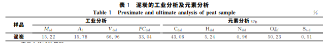 泥炭 樣 品 采 自 貴 州 畢 節(jié),按 照 國(guó) 標(biāo) GB/T 474—2008要求制成空氣干燥樣,采 用 國(guó) 標(biāo) GB/T 212—2008方法進(jìn)行工業(yè)分析,所用儀器為上海一 恒 科 技 有 限 公 司 (一恒DHG-9053A恒 溫 干 燥 箱 和 NaberthermL24/11/P330箱形 電 爐,元 素 分 析 選 用 ELEMENTARElementarVarioMACRO 元素分析儀.結(jié)果見(jiàn)表1.
