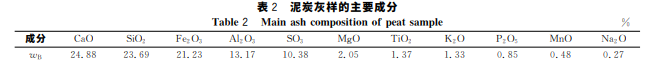 按 國(guó) 標(biāo) GB/T1574—2007 方 法 制 備 泥 炭 灰 樣,使用 RIgakuZSXPrinusX 射線熒光分析儀進(jìn)行灰成分分析,結(jié)果見(jiàn)表2.分 別 按 國(guó) 標(biāo) GB/T 2677.10—1995,GB/T 745—2003,GB/T2677.8—1994,GB/T10337— 2008方法測(cè)定 泥 炭 樣 品 的 綜 纖 維 素(纖 維 素 和 半 纖維素的總和)、多戊糖(半纖維素的主要成分)、酸 不溶木質(zhì)素及其衍生物、酸溶木質(zhì)素及其衍生物含量。