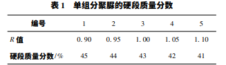 將制備的潛固化型單組分聚脲均勻地涂刷在四 氟板上,膜厚控制在 1 mm 左右,表干后于溫度為70℃的烘箱中放置 24 h,取出,在室溫熟化 7 d 測定 其性能。硬段質(zhì)量分?jǐn)?shù)如表 1 所示。
