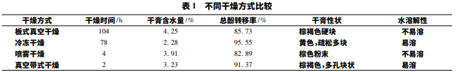 表 1 顯示,板式真空干燥時(shí)間最長,干 膏含水量最高; 冷凍干燥所得干膏性狀理想,總酚損失最 小,含水量低,但耗時(shí)相對(duì)較長; 噴霧干燥時(shí)間短,但總 酚轉(zhuǎn)移率低; 真空帶式干燥總酚轉(zhuǎn)移率較高,僅次于冷凍 干燥,而且干燥時(shí)間短,含水量低,干膏性狀理想,故選 擇該方法進(jìn)行干燥。