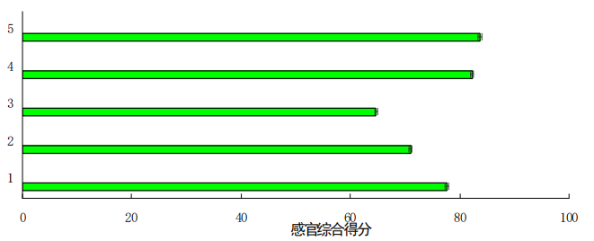 按照感官評分標準,由食品專業(yè)評價人員對產(chǎn)品進行綜合評分,對評分數(shù)據(jù)采用加權(quán)平均值算出總分,整理如圖1。由圖1可知,從感官評價考察干果質(zhì)量:真空干燥法>微波結(jié)合真空干燥法>鼓風干燥法>遠紅外線干燥法>微波干燥法。真空干燥的感官得分最高,干燥效果最好,其次是微波結(jié)合真空干燥,效果最差是微波干燥。不過通過真空干燥和微波結(jié)合真空干燥制得的產(chǎn)品感官得分之間沒有顯著的差異,都能良好的保持果品的外觀、肉質(zhì)及滋味。但是與其他三種干燥方式差異顯著。從感官評價方面角度,可以采用真空干燥、微波結(jié)合真空干燥這兩種方式對羅漢果進行干燥效果更佳。