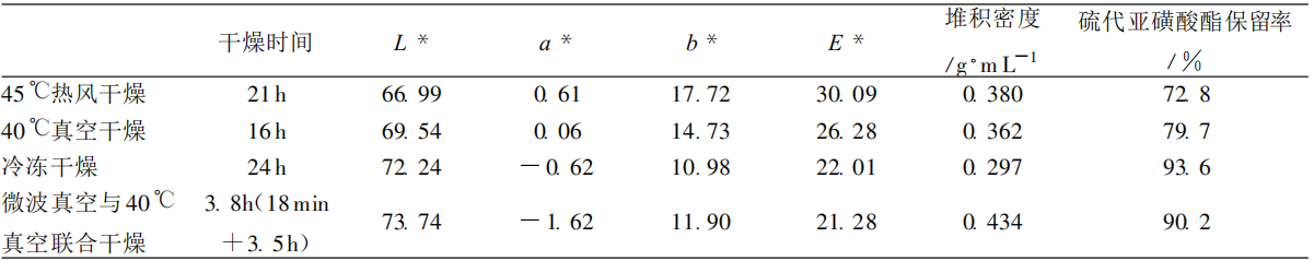 從表1可以看出,通過4種干燥方法比較,45℃熱風(fēng)干燥顯然是最為經(jīng)濟(jì)的干燥方法,但由于熱風(fēng)干燥時(shí)間長,干燥后硫代亞磺酸酯保留率低,顏色黃,與冷凍干燥的蒜相比有明顯的差異。40℃真空干燥雖然干燥溫度較低,但由于干燥室內(nèi)對流傳熱幾乎不存在,而是以熱傳導(dǎo)為主,所以傳熱速度慢,干燥時(shí)間仍較長,蒜干燥后硫代亞磺酸酯保留率較低, 顏色略黃,與冷凍干燥的蒜相比有較顯著的差異 。冷凍干燥蒜的干燥質(zhì)量最好,干燥后蒜的硫代亞磺酸酯保留率很高,可達(dá)93%以上,色澤白,蒜質(zhì)構(gòu)疏松,但其缺點(diǎn)是設(shè)備昂貴, 能耗大,成本高。目前國際市場對脫水大蒜粉的需求量很大,采用微波真空干燥與40℃真空干燥聯(lián)合干燥法,干燥時(shí)間大大縮短,而干燥后蒜的硫代亞磺酸酯保留率比較接近冷凍干燥,可達(dá)到90%;與冷凍干燥蒜的色差差異極小, 甚至比凍干蒜的白度略好,但唯一不足的是蒜質(zhì)構(gòu)緊密,不如冷凍干燥疏松。