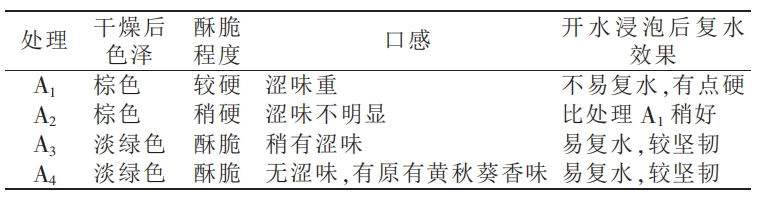 從表1可以看出,黃秋葵干燥后,處理A1呈棕色,咀嚼較硬,有澀感,開水浸泡后不易復(fù)水,有點硬;處理A2呈棕色,咀嚼稍硬,澀感不明顯,開水浸泡后復(fù)水效果比處理A1稍好;處理A3呈淡綠色,咀嚼酥脆,稍有澀感,開水浸泡后易復(fù)水,較堅韌;處理A4 呈淡綠色,咀嚼酥脆,無澀感,開水浸泡后易復(fù)水,較堅韌。結(jié)論與討論試驗結(jié)果表明,如果采用恒溫鼓風(fēng)干燥,干燥的溫度為80℃;黃秋葵干燥最優(yōu)工藝為:熱水焯一下,撈出瀝干,放的最優(yōu)工藝為將不帶花托黃秋葵花放入冷凍盤,經(jīng)-30℃低溫冷凍,后經(jīng)真空凍干12h。經(jīng)真空凍干工藝干燥后保持了果實與花的原有形狀和色澤;酥脆,可作為休閑即食食品;無澀味,保持了黃秋葵和黃秋葵花的自有香味;黃秋葵用熱水焯一下,再經(jīng)真空凍干,效果更好,口感更佳。