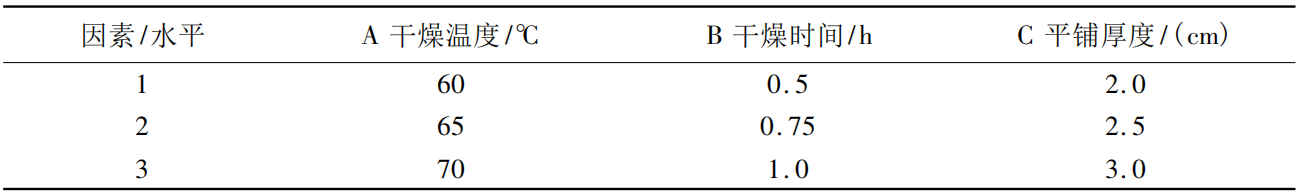 通過(guò)對(duì)鼓風(fēng)干燥時(shí)的溫度、時(shí)間及其荷葉平鋪厚度進(jìn)行單因素及優(yōu)化實(shí)驗(yàn),確定最佳的鼓風(fēng)干燥時(shí)間、溫度及其荷葉平鋪厚度微波-鼓風(fēng)干燥最佳方案的確定選取鼓風(fēng)干燥溫度、時(shí)間及平鋪厚度三個(gè)因素,以感官評(píng)分為指標(biāo),正交試驗(yàn)因素水平表見(jiàn)表1