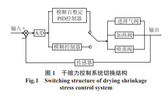 木材實(shí)際干縮力值與設(shè)定干縮力值之間會(huì)有誤差E和誤差變化率EC。對(duì)干縮力的控制,控制算法的選 擇主要依據(jù)誤差變化范圍確定。誤差范圍大時(shí),選擇 模糊控制,通過調(diào)節(jié)加熱閥,使實(shí)際干縮力值更快接近 設(shè)定值;小誤差范圍則選擇模糊PID控制,通過調(diào)節(jié)進(jìn) 排氣閥或噴蒸閥,使實(shí)際干縮力值基本與設(shè)定值相同, 提高控制精度。干縮力控制系統(tǒng)切換結(jié)構(gòu)如圖 1 所示。