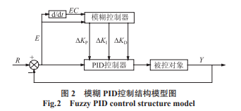 模糊PID控制系統(tǒng)中,R為干縮力的設(shè)定值,Y為干 縮力的實(shí)際值,E為誤差,EC為誤差變化率,其結(jié)構(gòu)如 圖 2 所示。模糊PID控制主要利用模糊控制原理在線 整定PID三個(gè)參數(shù)(即比例系數(shù)KP 、積分系數(shù)KI 、微分 系數(shù)KD的修正量DKP、DKI 、DKD),找出PID的三個(gè)參數(shù) 與誤差E和誤差變化率EC之間的模糊關(guān)系,在運(yùn)行中 不斷檢測(cè)誤差E和誤差變化率EC,根據(jù)確定的模糊控 制規(guī)則來對(duì)三個(gè)參數(shù)進(jìn)行調(diào)整,從而滿足在不同誤差E 及誤差變化率EC時(shí)控制系統(tǒng)良好的控制效果。