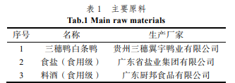 三穗鴨是我國地方優(yōu)良畜禽品種,屬于中國地 方名鴨,具有產(chǎn)蛋多、牧飼力強、膽固醇低、肉質(zhì)細嫩鮮香等特點,深受大眾喜愛,是我國優(yōu)勢畜禽品 種之一。三穗鴨的營養(yǎng)物質(zhì)豐富、營養(yǎng)價值較高,可以此為基礎(chǔ)制成各種帶有地方特色的鴨肉制品, 其中三穗血漿鴨是其代表之一。三穗血漿鴨肉質(zhì)鮮 嫩,味道獨特,鮮香醇正,風(fēng)味優(yōu)良,但其腌制方法 多為傳統(tǒng)民間制法,沒有標(biāo)準(zhǔn)化生產(chǎn)體系,不利于工 廠標(biāo)準(zhǔn)化生產(chǎn),限制了三穗鴨產(chǎn)品的生產(chǎn)與發(fā)展,故 規(guī)范其腌制加工技術(shù),對提升三穗血漿鴨產(chǎn)品質(zhì)量及 穩(wěn)定性有著極其重要的意義。