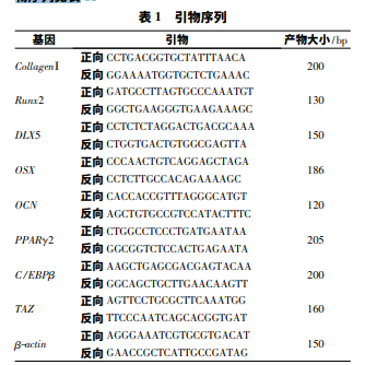 經(jīng)典 TRIzol 提取總 RNA,檢測濃度、 提純、逆轉(zhuǎn)錄,rRT-qPCR 采用一步法,按照說明書進行操 作,2-△△Ct 法分析各基因表達差異。然后,應用 Invitrogen 在線 引 物 設 計 軟 件 OligoPer-fectTM Designer 設 計,采 用 BLAST 進行比對,探針序列由美國 Invitrogen 公司合成,根 據(jù) NCBI 數(shù)據(jù)庫序列設計 ( CollagenΙ ID 100199754,Runx2 ID 12393,DLX5 ID 13395,OSX ID 170574,OCN ID 632, PPARγ2 ID 19016,C/EBPβ ID 12608,TAZ ID 66826) ,引 物序列見表 1。