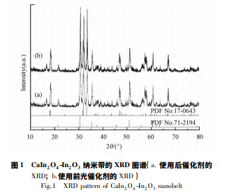 為了考察合成樣品的晶型結(jié)構(gòu),采用 XRD-6100 型射線衍射儀對(duì)樣品物相進(jìn)行測(cè)試( 圖 1) .由圖可 知,兩者在 18. 20°、18. 35°、24. 23°、31. 66°、31. 99°、 33. 40°、37. 98°、40. 58°、43. 64°、47. 09°、47. 70°、 56.55°、57.91°、67.14°的衍射峰與其對(duì)應(yīng)的( 120) 、 ( 200 ) 、( 220 ) 、( 040 ) 、( 320 ) 、( 121 ) 、( 131 ) 、 ( 420) 、( 141) 、( 401) 、( 510) 、( 360) 、( 170) 、( 621) 晶面與正交晶系結(jié)構(gòu) CaIn2O4 的標(biāo)準(zhǔn)卡片( 戈磊等, 2009) ( PDF No. 17-0643) 基本一致.同時(shí),在 2θ 為 21.49°、30.58°、35.46°、51.03°和 60.67°處出現(xiàn)較強(qiáng) 的衍射峰,與 In2O3 標(biāo)準(zhǔn)卡片 PDF No.06-0416 的特 征衍射峰一致( Khan et al.,2012) ,為立方晶系結(jié)構(gòu) 的 In2O3 .這說明制備樣品中含有正交晶系結(jié)構(gòu)的 CaIn2O4 和立方晶系結(jié)構(gòu)的 In2O3 .且使用前后樣品 的衍射峰未出現(xiàn)新的衍射峰或原有衍射峰消失的 現(xiàn)象,這表明 CaIn2O4-In2O3 納米帶可循環(huán)使用且穩(wěn) 定 性 良 好. 采 用RIR方 法( Daliet al . ,1 9 9 8 ; Zhouet al.,2018) 計(jì)算樣品中 In2O3 的相對(duì)質(zhì)量分?jǐn)?shù),計(jì) 算公式為: CaIn2O4 = ( ICaIn2O4 /( IIn2O3 +ICaIn2O4 × 1 /k) ) × 100%,其中,ICaIn2O4 和 IIn2O3 是 CaIn2O4 和 In2O3 強(qiáng)度為 100%的峰值,k 是 CaIn2O4 與 In2O3 的 RIR 值的比值.計(jì)算得樣品中 In2O3 的相對(duì)質(zhì)量 分?jǐn)?shù)約為 48.5%.