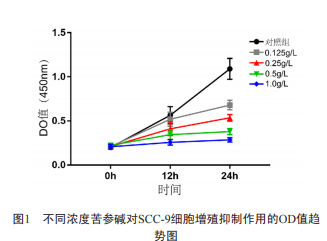 將處于對數(shù)生長期的SCC-9細胞,按照1.0×104個細胞 /孔的密度接種于96孔板,每孔100 μL,每組設(shè)3個復孔。 24 h后去除培養(yǎng)基,以不加藥的完全培養(yǎng)基組作為對照組, 分別以完全培養(yǎng)基和苦參堿配制0.125、0.25、0.5和1.0 g/L 的苦參堿溶液作為藥物組作用于SCC-9細胞,每孔100 μL。 12、24 h后向每孔中加入10μL CCK-8試劑,于37℃細胞培養(yǎng) 箱中孵育4 h,在酶標儀450nm處測量各孔OD值。