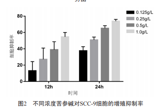苦參堿抑制口腔癌細胞SCC-9的增殖:CCK-8法檢測不 同濃度的苦參堿作用于SCC-9細胞后,在不同時間的細胞 增殖抑制作用。圖1所示,苦參堿可以抑制SCC-9細胞的增 殖,且呈濃度和時間依賴作用。除12 h的0.125 g/L的苦參堿 作用于細胞后與對照組相比無統(tǒng)計學意義,其余各濃度組 在12、24 h后與對照組相比,差異均有統(tǒng)計學意義。 我們將OD值換算成細胞抑制率,圖2所示,各實驗組的 細胞抑制率隨著苦參堿濃度的升高而增加,呈劑量依賴關(guān)系。