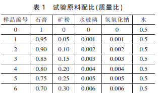 試件的配比:向石膏中加入不同量的礦粉、水、 水玻璃、氫氧化鈉。 使水的質(zhì)量占礦粉和石膏總質(zhì) 量的 50%,水玻璃和氫氧化鈉用量均為礦粉質(zhì)量的 2%。 在此基礎(chǔ)上調(diào)整礦粉同石膏的質(zhì)量比分別為 0.05、0.10、0.15、0.20、0.25、0.30。 此外,制備空白組 試件,空白組石膏和水的比例為 1∶0.5。 具體配比如表1。 試件的制備與養(yǎng)護:按照 GB/T 17671—1999 標 準進行攪拌與成型,在相對濕度為 50%~60%,溫度為 18 ℃~22 ℃的條件下靜置 24 h 后脫模并覆膜養(yǎng) 護,覆膜養(yǎng)護溫度為 38 ℃~42 ℃,在該條件下養(yǎng)護 至 28 d 后放入鼓風干燥箱中,在 38 ℃~42 ℃的條件 烘至恒重,然后按照標準 GB/T 17671—1999 測試的 方法測試其抗折、抗壓強度。 此外,對所制備的試件 進行泡水處理,泡水時間 24 h,用于測試其耐水性能。