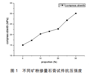 從上述試驗中不難發(fā)現(xiàn),礦粉加入脫硫建筑石 膏中大幅提高了其抗壓強度,抗折強度也有一定提 高,但抗壓強度增幅遠高于抗折強度。 這意味著隨 著礦粉的大量添加,改性石膏材料的壓折比增加,材料顯脆性。 同時,礦粉的加入也大幅提高了石膏材料的耐水性能,脫硫石膏的耐水系數(shù)從 0.31 增長至 0.66。