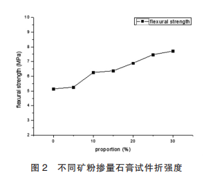 從圖 1 中可看出隨著礦粉摻量的不斷增加,石 膏的抗壓強度增幅明顯,當?shù)V粉用量占膠凝材料總 用量的 30%時,改性石膏的抗壓強度達 30.2 MPa,較 未添加礦粉的空白組試件強度高約一倍。 是由于礦 粉在水玻璃和氫氧化鈉的激發(fā)下,礦粉不斷水化形 成水化硅酸鈣,提高了石膏材料的密實性,提供支 撐作用,從而提高了改性石膏的抗壓強度。從圖 2 中可看出隨著礦粉摻量的不斷增加,石 膏的抗折強度增幅明顯,當?shù)V粉用量占膠凝材料總 用量的 30%時,改性石膏的抗折強度達 7.71 MPa,較 未添加礦粉的空白組試件強度高約 50%。 這是由于 礦粉在水玻璃和氫氧化鈉的激發(fā)下,礦粉不斷水化 形成水化硅酸鈣,提高了石膏材料的密實性,提供 支撐作用,從而提高了改性石膏的抗折強度。
