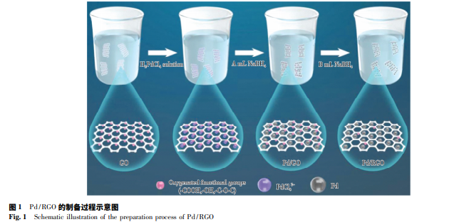采用經(jīng)典的 Hummers 法制備氧化石墨。具體步驟如 下: 量取 23 mL 濃硫酸置于燒杯中,在低溫冷卻液循環(huán)泵中 將濃硫酸 冷 卻 至 0 ℃ 以 下,再 加 入 1 g 石 墨 粉 和 0. 5 g NaNO3。邊攪拌邊向燒杯中緩慢加入 3 g KMnO4,并保持體 系溫度不超過 20 ℃。將燒杯轉(zhuǎn)移至 35 ℃ 恒溫水浴鍋中攪 拌 2 h,再緩慢加入 46 mL 去離子水,維持體系溫度在 98 ℃以 下,繼續(xù)攪拌 15 min。最后,向反應(yīng)體系中加入 10 mL H2O2+140 mL H2O,得到金黃色產(chǎn)物,趁熱過濾,用 5%的 HCl 充分 洗滌濾餅至濾液中無 SO4 2- 被檢測出。再對沉淀物進(jìn)行透析 處理,用去離子水洗滌至洗出液達(dá)到中性,所得產(chǎn)物在 50 ℃ 真空干燥箱(上海一恒DZF-6020真空干燥箱)中干燥 12 h 備用。 1. 2 催化劑材料( Pd /RGO) 的制備 采用硼氫化鈉化學(xué)還原法制備 Pd /RGO,制備過程如 圖 1 所示。具體步驟如下: 首先將 20 mg 氧化石墨與 20 mL 蒸餾 水 混 合,超 聲 分 散 2 h。將 一 定 量 的 H2PdCl4 溶 液 ( 10 mmol /L,H2PdCl4 溶液是由 PdCl2 溶解于 HCl 中配制而 成) 與已剝離的 GO 懸浮液混合,超聲處理 30 min。將超聲處 理后的混合液轉(zhuǎn)移至冷卻液循環(huán)泵中,當(dāng)體系溫度降至 0 ℃ 后向混合液中加入一定量的 NaBH4 溶液反應(yīng) 1 h,此時(shí)得到 的產(chǎn)物命名為 Pd /GO。繼而將過量的 NaBH4 溶液加入反應(yīng) 液中,攪拌 6 h 以保證 GO 最大程度地被還原為石墨烯納米 片。然后將產(chǎn)物進(jìn)行離心,水洗、醇洗各三次,在真空干燥箱 中60 ℃下干燥 12 h。所得樣品命名為 Pd /RGO-1。保持其他 條件不變,將還原溫度由 0 ℃升至 25 ℃和 50 ℃,所得到的催化劑分別命名為 Pd /RGO-2、Pd /RGO-3。