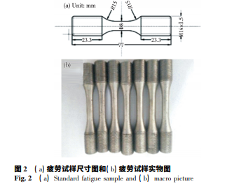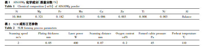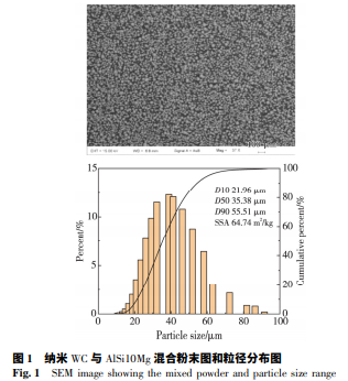 采用浙江 亞 通 焊 材 有 限 公 司 制 備 的 納 米 WC 和 AlSi10Mg 合金粉末為 SLM 沉積材料,通過(guò)激光粒徑分析儀測(cè) 得上述兩種粉末粒徑分別為 100 ~ 200 nm、15 ~ 53 μm,AlSi10Mg 粉末元素含量如表 1 所示。利用混料機(jī)混合兩種粉 末,混料時(shí)間為 20 min,混合粉末 SEM 照片與粒徑分布如 圖 1 所示。由圖 1 可知,混合粉末分布均勻,球形度良好,從 而保證了成形時(shí)粉末的流動(dòng)性。為減少粉末吸潮對(duì)實(shí)驗(yàn)結(jié)果的影響,使用 DZF-6050B 型真空干燥箱(上海一恒DZF-6050B臺(tái)式真空干燥箱)在 110 ℃ 真空條件 下( 0. 2 Pa) 對(duì)混合粉末進(jìn)行 5 h 的烘干處理。通過(guò)選區(qū)激光 熔化設(shè)備 AFS-M260 制備 WC /AlSi10Mg 復(fù)合材料試樣,成形 環(huán)境為氬氣氛圍,成形工藝參數(shù)如表 2 所示。實(shí)驗(yàn)中分別成 形尺寸為 15 mm×15 mm×15 mm 的塊狀試樣和七組標(biāo)準(zhǔn)疲勞 拉伸試棒,疲勞拉伸試棒尺寸和形貌如圖 2 所示。