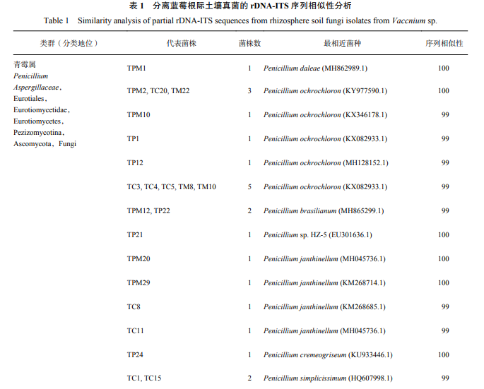 上海一恒對(duì)有關(guān)藍(lán)莓根際土壤真菌研究的較少。雖然藍(lán) 莓為栽培種植,但了解藍(lán)莓根際土壤真菌多樣性 對(duì)其土壤真菌種群特性研究具有重要意義。本研 究從藍(lán)莓根腐病發(fā)生區(qū)附近健康藍(lán)莓根際土壤中 分離得到的真菌,主要屬于青霉屬(27.50%)、 木霉屬(16.75%)、鐮孢屬(16.75%)、孢球托 霉 屬 ( 16.75%), 籃 狀 菌 屬 ( 5%)、 曲 霉 屬 (3.25%)和小球殼孢屬(1.25%)等,與研究的 其他物種根際土壤真菌相近。藍(lán)莓根際土壤 真菌的優(yōu)勢(shì)屬與其他物種根際土壤的優(yōu)勢(shì)種群相 似,但在種群組成上存在一定差異,可能是由于 藍(lán)莓菌根菌的存在所致。