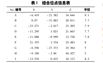 利用 Discovery Studio 2. 5 的 From Receptor Cavities 模塊對 UGT1A1 蛋白空腔進(jìn)行自動識別,共獲 得 9 個口袋( A ~ I 活性口袋) ,坐標(biāo)及半徑如表 1 所示。