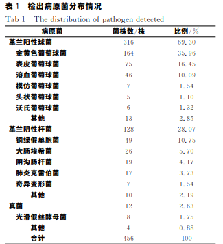 942份標(biāo)本中檢出病 原菌共456株,檢出率為48.41%;其中檢出革蘭陽 性球菌316株,占69.30%;革 蘭 陰 性 桿 菌128株, 占28.07%;真菌12株,占2.63%。革 蘭 陽 性 球 菌 中金黃色葡萄球菌、表皮葡萄球菌及溶血葡萄球菌 分別占35.96%、16.45%和10.09%;革蘭陰性桿菌 中銅綠假單胞 菌 及 大 腸 埃 希 菌 分 別 占10.75%、5. 70%;真菌中光滑假絲酵母菌占1.75%。具體分布 情況見表1。