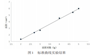 磷酸(PBS)緩沖溶液制備:稱取磷 酸氫二鈉和磷酸二氫鈉適量,加入適量去離子水,制 成 pH=7.2 的磷酸緩沖溶液。 工作液:將生理鹽水和配好的 PBS 溶液按照 17∶1 的比例配制工作液。 牛纖維蛋白原溶液:取 0.3 g 牛纖維蛋白原,加 工作液 100 mL 溶液。配制成 0.3% 的牛纖維蛋白原 溶液。 凝血酶溶液:取凝血酶 1.0 g,加生理鹽水制成 10 U/mL 溶液。 標準曲線建立:取工作液 100 mL,采用電熱套 對其加熱煮沸,加入 0.5 g 瓊脂糖,待其徹底溶解后, 取出、放涼至 50 ℃,加入 20 mL 牛纖維蛋白原溶液, 加入 1.0 mL 10 U/mL 凝血酶溶液,振蕩后導入培 養(yǎng)皿內(nèi)部,每個培養(yǎng)皿 10 mL,放入 4 ℃冰箱冷藏 15 min。用直徑為 1 mm 打孔器進行打孔,并在每個 孔內(nèi)加入“2.1.1”項下各尿激酶標準溶液 10 μL,放 入恒溫培養(yǎng)箱培養(yǎng) 12 h(37 ℃)。取出后采用游標 卡尺對溶圈進行測定,計算溶圈面積。以溶圈面積 為縱坐標,以尿激酶活力(U)的對數(shù)為橫坐標進行 線性回歸,得出實驗結(jié)果如圖 1。 實驗結(jié)果表明:線性方程為 Y=1.564X-1.8635, R2 =0.9972,線性良好。