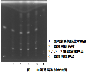 精密稱定斂痔散及血竭陰性樣品 0. 1g,加乙醚 10ml,振搖 10min,濾液濃縮至 2ml,取上清液即 可。同法制備血竭對(duì)照藥材溶液。分別取血竭素高氯酸鹽 對(duì)照品溶液和以上 3 種溶液點(diǎn)于同一硅膠 G 板,以三氯甲 烷∶ 甲醇( 19∶ 1) 為展開劑,置展開缸中預(yù)飽和 30min,展開, 晾干,加熱至斑點(diǎn)顯色清晰。置 366nm 紫外燈下檢視,供試 品在與對(duì)照品和對(duì)照藥材相應(yīng)的位置上顯相同顏色的斑 點(diǎn),且陰性無干擾。( 見圖 1)