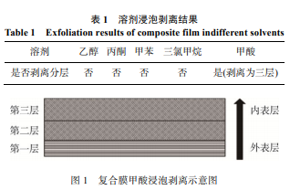表 1 為復(fù)合膜在各類溶劑中浸泡 2 h 后剝離結(jié)果, 其 中僅在甲酸中, 復(fù)合膜被剝離為 3 層結(jié)構(gòu), 為便于后續(xù)表 述, 復(fù)合膜從外表面至內(nèi)表面分別標(biāo)記為第 1 層、第 2 層 和第 3 層。