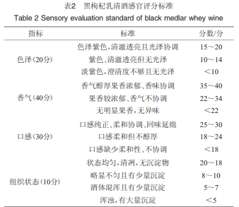 感官評(píng)價(jià):根據(jù)國(guó)家標(biāo)準(zhǔn) GB/T 16861—1997《感官分 析通過(guò)多元分析方法鑒定和選擇用于建立感官剖面的描 述詞》,選擇描述詞,根據(jù)GB/T 10220—2012《感官分析 方 法學(xué) 總論》建立感官評(píng)分標(biāo)準(zhǔn),滿分100分。選定20人 (男、女各10人),根據(jù)表2標(biāo)準(zhǔn)主要圍繞色澤、香氣、口感和 組織狀態(tài)對(duì)黑枸杞乳清酒進(jìn)行感官評(píng)定。黑枸杞乳清酒中揮發(fā)性風(fēng)味物質(zhì)分析:利用HS-SPMEGC-MS法,量取8.0 mL黑枸杞乳清酒放入20 mL SPME 樣品瓶中,將老化后的萃取頭插入樣品瓶頂空部分進(jìn)行萃 取,在60 ℃水浴條件下平衡10 min,萃取頭頂空吸附30 min 后,在GC進(jìn)樣口釋放1 min。 氣相色譜-質(zhì)譜條件:DB-5毛細(xì)色譜柱(30 m×0.25 mm, 0.25 μm);載氣為氦氣(He);載氣流速1.0 mL/min;離子源溫 度230 ℃;進(jìn)樣口溫度250 ℃;升溫程序:初始溫度50 ℃保 持1 min,以2 ℃/min升溫至100 ℃保持3 min,再以4 ℃/min 升溫至220 ℃保持10 min,不分流進(jìn)樣;質(zhì)量掃描范圍50~ 550 m/z;溶劑延遲時(shí)間1 min。