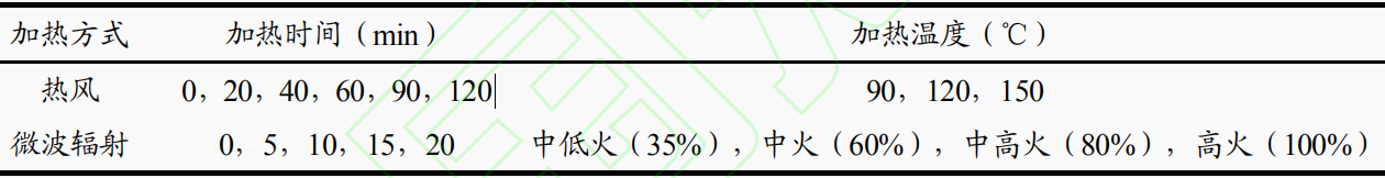 選取新鮮成熟的浙江省普通油茶籽。分別采用熱風(fēng)式烘箱和微波爐等對(duì)油茶籽進(jìn)行熱風(fēng)和微波輻射等兩種形式的加熱處理,加熱結(jié)束后自然冷卻至室溫后剝殼,冷藏備用。兩種加熱方式及加熱條件,實(shí)驗(yàn)所用加熱方式及條件見(jiàn)表1。